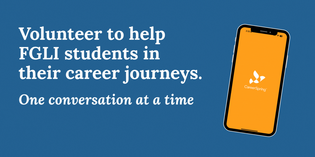 Volunteer Advisors offer 30-minute virtual conversations with FGLI (first-generation, low-income) students across the United States.